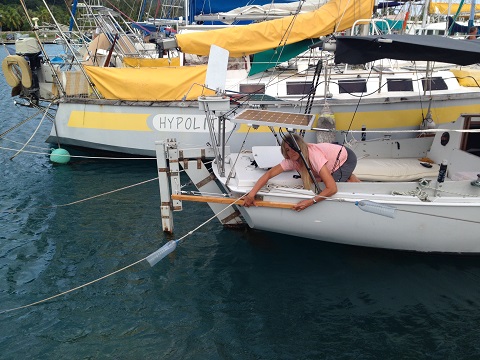 Our DIY self steering system is based on the rudder head mount (RHM) pendulum self steering system developed by Jan Alkema. If it works, it will save us countless hours of hand steering.![]() Rudder head mounted self steering system, showing wind vane, auxiliary rudder, pendulum oar carrier, pendulum oar and restraint line. | ![]() When boat gets off course, wind vane cants over, causing pendulum oar to swing out, forcing auxiliary rudder to opposite side, thus steering boat back on course. |