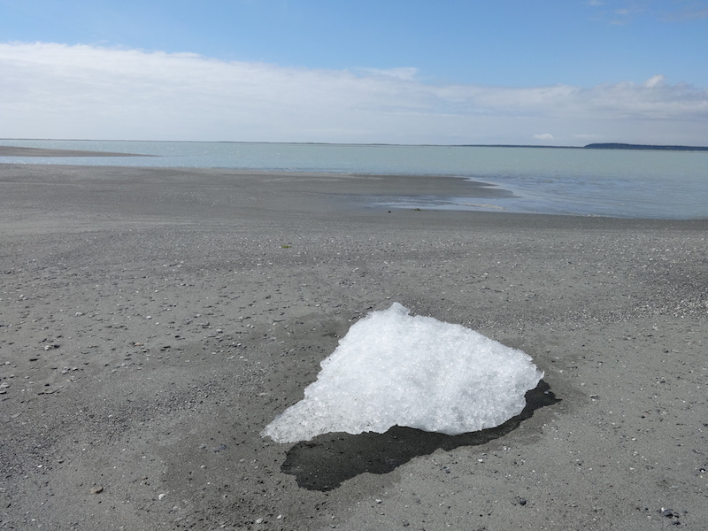 ![]() Finally across the Alsek. Looking north past beached glacier ice. Alsek River/Dry Bay in background. |