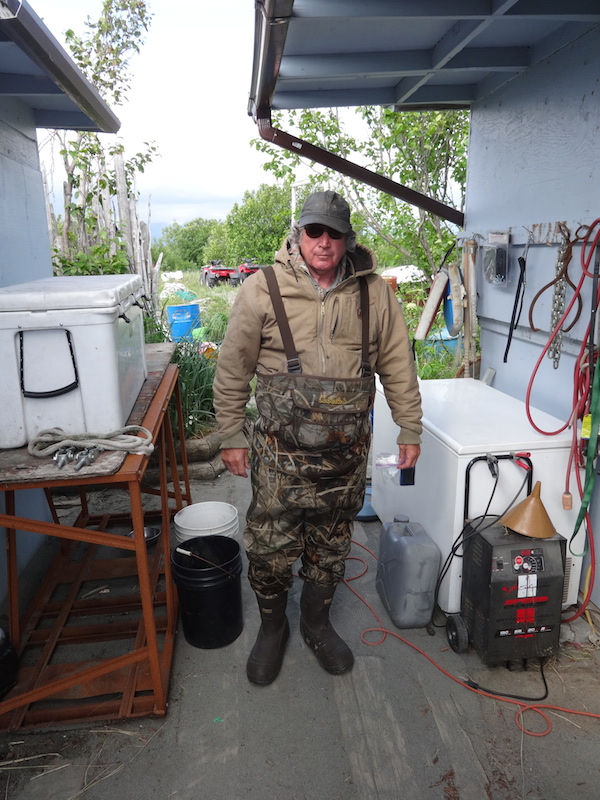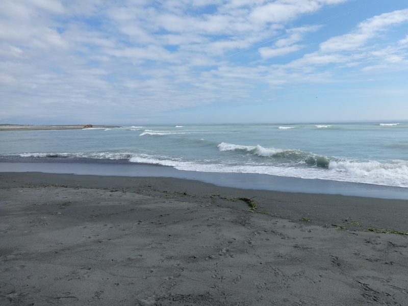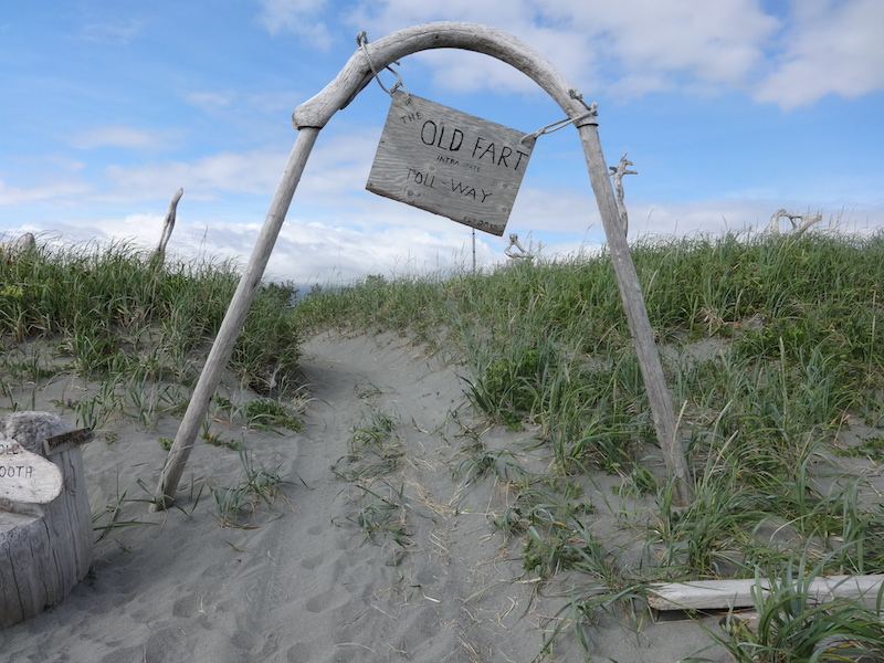 goodness" is a recipe I haven't tried before and is like rocket fuel. I've also way over-estimated my caloric needs for the trip, given the flat beach walking and warm weather. I'm just not burning calories like I normally do on a backpacking trip. Still, I'm reluctant to dump any of it, not knowing what lies ahead. The morning is sunny and warm with a light westerly breeze. Should be good conditions for crossing the Alsek. Most of the mountain peaks are socked in by clouds but the top of Mt Fairweather is in full view, though dim with the morning sun backlighting it. Sparrows sing in the tall wildrye beach grass nearby. I'm anxious about the crossing and want to get on with it. Breaking camp, I wade across the shallow braided side channel of Muddy Creek and continue east barefoot across the soft mud and sand of the tide flat. Soon I'm dodging logs stranded on the tide flat, then find a way though them to the south bank of Muddy Creek close to where it flows into the Alsek. Although labeled Muddy Creek, its width and current would make it a major river in much of the American West. I haven't waited for high tide like Pat suggested, but I'm right where he recommended launching. I glass the Alsek, watching chunks of white glacier ice flow past, moving fast. The other side is about 1/2 a mile away. The surface is wavy, but there's no whitewater except where the current flows past submerged logs and root balls. I'll need to keep a sharp lookout to avoid these. Clearing some driftwood branches out of the way, I open a narrow bit of sand between logs in which to launch the raft. Twenty minutes later I'm ready to launch. I check my watch. It's 11:40 AM. Despite the anxiety, it feels good to get out on the water. In less than a minute I'm in the main flow of the Alsek, paddling hard, but controlled. The current is fast, maybe 8 knots or so, but lining up objects on the opposite bank I can see that I'm doing fine and will be across before I've drifted downstream more than 1/4 mile or so. Seven minutes later I'm there, pleased that the crossing has gone so quickly. The bank, though, turns out to be a sandy island, not the south bank of the river yet. Drifting past the lower end of the island, I paddle south in the relatively slow water of its downstream side. Soon I see another channel, almost as wide as the one I've just crossed, and faster. More large white chunks of ice quickly drift past. Here it's wavier, but still no real whitewater. I decide to portage up the island and launch further up. I land, unclip the pack from the raft, shoulder the pack and carry paddle and raft upstream along the edge of the island. It's mostly sand with some cobble and even barefoot the walking is easy. Hundreds, perhaps thousands of sea gulls form a white cluster near a pond in the middle of the island. This must be a relatively safe nesting area, protected from all but avian predators. 1/4-mile upstream a narrow channel cuts across the island and I launch again from there. As I do so, I hear the alarming sound of air bubbles escaping from under the raft. It turns out to be just a pocket of air escaping from under the raft, not a leak. I get in and launch. The views of the Fairweather mountains are spectacular, but the camera is packed and I'm too focused on avoiding submerged logs to think about photos. Like before, I'm soon across, then into the lee of what proves to be another island. Seals clamber off the sandy bank and watch me from the safety of the water. I cross one channel after another, all much narrower than the two I've already crossed. There are occasional areas of whitewater, but they're small and easy to negotiate. I lose track of how many of these smaller channels I've crossed, but eventually reach the edge of the tide flat on the south bank and am truly across. My watch says 1:05 PM. Including the portage, it's taken me an hour and 25 minutes to fully cross the Alsek. After the trip, I check on Google Earth and see that the total paddling distance has been almost 2-1/2 miles. I haul raft and pack up to a log on the sand bank, then stop for lunch on a driftwood log. The wind is NW at around 15 mph and a bit chilly as it blows across the wide expanse of icy glacier water in Dry Bay. It feels good to be walking again as I head west back out to the beach. Walking west across the tide flat, then over the sand dunes, the air quickly heats up. I cross more ATV tracks as well as those of brown bears and wolves. Less than an hour later I'm standing on a high dune overlooking the mouth of the Alsek. With binoculars, I see breaking waves well into Dry Bay and am glad to have had the good fortune of meeting Pat. As I walk south, the beach is covered with ATV tracks, all leading to a temporary commercial fishing camp about 5 miles south of here, near the mouth of the East Alsek River. Although shown on maps as the East Alsek River, it's no longer part of the much larger Alsek River that I just crossed. That changed during the big 1964 earthquake. Now it's separate from the Alsek and locally is now simply called East River. An hour and a half later, I come to more extensive surf marking the mouth of East River. The surf and high tide rule this out as a crossing point. I follow the north bank of the river inland looking for a better place to cross. I'm curious to see the fishing camp and once again need drinking water. I stop several times to taste the river water, but so far it's all salty. Although I'm now within the boundary of Glacier Bay National Park, the summer fishing camp has a history much longer than the Park does and has been grandfathered in. It's a collection of small cabins with a landing strip for bush planes. Following ATV tracks along the bank for about half a mile, I come to a driftwood arch covered with signs. Some of the signs give distances to various points on earth, others express a decidedly conservative political perspective. Notable is the "Harry Reid Shithouse." I figure the owner wi