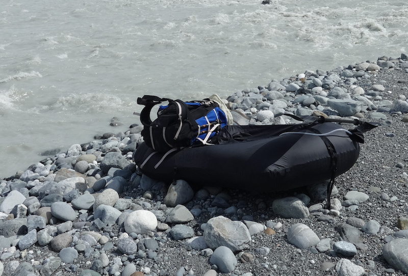 I wake about 7:00 AM, the weather hasn't arrived yet. The sky is partly cloudy for the first time in days, but still sunny for the moment. I'm relieved to have had a peaceful night, though am alarmed when I check the log with binoculars and don't see the food bags. Putting on rain pants to walk through the dewy grass, I'm greatly relieved to find them untouched. I'm tired this morning after yesterday's boulder hopping. I leave camp at 8:00 AM and by 9:30 I'm at Justice Creek. It's a rain-fed stream and has dried back 100 yards from where it was just 2 days ago. I go upstream to where the water ends and fill my bottles. A couple Stellers jays hop around on the rocks, apparently curious to see if I have any treats for them. It's hot this morning and the surf is noticeably higher, suggesting that yesterday's high clouds have indeed signaled a coming low. By late morning increasing clouds begin to shroud the mountains. Along the sand beach I come across a skate. It's wingspan is about 3 feet. It's been washed onto the beach by the surf and is upside down. With hiking poles and the toe of my shoe, I flip it over, head it toward the surf and wish it good luck. It will become a meal if a bear or wolf discovers it before it gets back to the water. Shortly after noon I reach the outflow of the Fairweather Glacier. It's up significantly from what it was 2 days ago and gives me pause. I study the outflow carefully. The current is fast. Like really fast. I watch it, trying to estimate the speed, and don't think I could run as fast as it's flowing. With binoculars I glass the opposite bank, then spot a possible take-out a couple hundred feet downstream. It's a small eddy, maybe 6 feet across. After that, things go to hell in a hurry. The pandemonium below the takeout, where river meets surf, is impressively chaotic. Or would be if I didn't think it might be the last thing I ever see. There's a tongue of slick water above an area of larger waves where I might be able to launch. From there I'll need to ride the tongue out into the main current, keeping the raft aimed at the opposite shore and paddling hard to avoid the bigger waves. If I hit them sideways, I could go over. If I don't paddle fast enough, I could also miss the eddy. Either way, it's pretty much game over. The surf roars and I feel queasy as I inflate the raft and prepare to launch. Everything critical is double-bagged. I study the flow again. The moves are all there. What's producing the anxiety is that there's no margin for error. The speed of the water and chunks of ice lining the rocky banks remind me that if I go over, I'll be lucky to reach shore and certainly won't have the raft or pack anymore. I decide to leave my shoes on. In that eventuality, I'd at least be able to walk to the next river. Strapping the pack tightly to the deck of the raft, I lower the bundle of raft and pack into the icy water, holding it firmly so it doesn't get away. Sitting down into the raft, I swing my legs in, still holding onto rocks along the shore. I grab the paddle, aim the raft across the current and shove off, paddling hard, everything happening faster than the time it takes to tell. It's almost exhilarating, but I'm way too focused to enjoy it. I just miss the rapid below the tongue, but paddle so hard that the raft hits the rocks on the opposite bank. I try to push off with the paddle but the bank is flying by so fast the paddle just bounces. Suddenly the eddy is just ahead and I stroke hard into it, quickly climb out, heave the paddle onto the bank and lift pack and raft out of the water. Then, adrenaline pumping and heart still pounding, I kneel down and kiss a rock, grateful to have gotten across. I lay the raft out to dry, pull out some food and have a slow lunch break, watching the chaos of current meeting surf and contemplating my good fortune. Given that this glacier-fed river isn't normally even mentioned as being difficult, I wonder what the 5 "tough" crossings south of Lituya Bay must be like now. It's 2:00 PM by the time I've finished lunch and am ready to leave the outflow. Just before going, I decide to lighten the pack. Taking out two gallon-sized bags of buttery goodness, I lean out over the rushing water and, with mixed feelings of regret and relief, empty the contents into the icy water. They immediately disappear beneath the surface, the current no doubt hurrying them toward the surf. My pack now 9 pounds lighter, I head north along the sandy beach, then onto boulders until I reach the first low point in the high sand cliffs above the beach. There I enter the forest and soon find the bear trail. By 6:00 PM I'm out of the forest north of Cape Fairweather. The wind has backed to the southwest. A half mile of cobble and boulder walking later I reach a small stream and have dinner as the first rain drops begin to fall. 200 yards down the beach I find a bench to camp on among chocolate lilies. It's a beautiful campsite. |