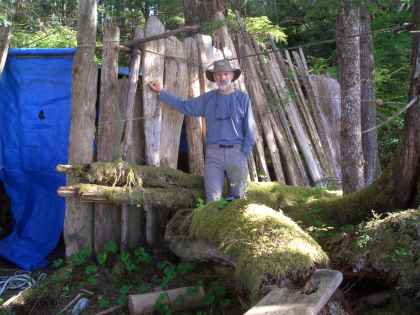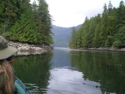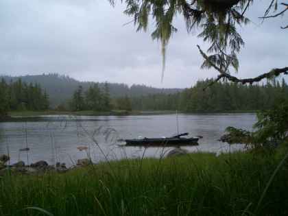 Channel)--7 miles Rained virtually all night, often hard. Woke about 7 AM, got up, dressed and launched in hard rain. Left camp in place. Paddled to Kumealon Passage. Got nearly all the way through until stopped by tidal rapid. David walked over and checked out rapid, and we waited about 45 minutes until current lessened near slack tide. Meanwhile 4 people in inflatable dinghy from sailboat in Kumealon Inlet managed to get through another channel. Shortly after that we were able to safely pass through. Rain also stopped, after having absolutely poured from camp to passage. Paddled through lagoon to estuary on south end and up estuary short distance to where it became too shallow. Other than birds and seal, no sign of wildlife. Kingfishers seem to particularly like the inlets. Stopped and chatted with folks in inflatable--British, 2 couples. Younger couple and skipper had sailed boat from England through Patagonia over course of last year. She said this coast reminiscent of Patagonia, but there wilder, no services, no people "except marine nomads." Paddled back through tidal rapid now on ebb, a bit of exciting ride, but got through easily. Area around inlet and lagoon heavily logged, some recently. Gravel operation (quarry) on north side of inlet from years past. Hard paddle out of inlet due to strong inflow wind. Raining again. After lunch, listening to forecast for high winds, decided to stay put. Napped. When got up later in afternoon started raining again. Strong SE winds and frequent heavy rain. Got water from nearby creek, made dinner and getting ready to enjoy a chapter of The Golden Spruce while listening to wind in trees and raindrops on tarp. Grateful for dry space.