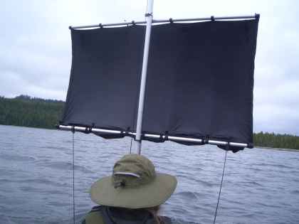 Woke without alarm about 7:15 AM to dappled sunshine on tent wall. Got fresh water from the creek. Had breakfast and headed out, catching 10-15 knot SE wind and south-setting current. Left camp about 9:30AM and got to Lowe Inlet 2 hours later, sailing all the way. Partly sunny, mild temps. Notable tide rip in Grenville Channel opposite Lowe Inlet. Sailed into Lowe Inlet. At Nettle Basin met senior couple from Victoria aboard their ex-commercial fishing boat Tropic Isle. They took pictures of us under sail--said they were going to put them on their website. Had many questions about our trip. Seemed impressed that we had come from Port Hardy, carrying everything on our little boat. Paddled over to Verney Falls, where many sockeye salmon were leaping out of the pool at the base of the falls. Landed at beach just north of falls and had lunch and David hiked to edge of lake just north of falls. Many blueberries, but not ripe yet. No sign of bears. Indian fish trap made of stones still mostly intact near falls. BC fisheries boat showed up while we were there. Many pilings on north side of Nettle Basin marking site of old cannery. Hard paddle back out to Grenville Channel bucking gusty inflow winds. Back out at Grenville current was now north setting, plus SE wind so made fast time sailing. After several miles put on fleece jackets under rain gear as rain approached from south, then skies opened up. A couple of passing power boats waved, probably looked on us with pity, but we were warm, dry and happy except for sore butts--glad to be out of reach of marauding insects. We've concluded that the Natives probably spent all their time out in dugout canoes to stay clear of insects--probably the reason they built the canoes in the first place! Got to Evening Point about 5 PM, but couldn't find Kimantas's recommended campsite. Backtracked down Grenville Channel about 150 yards south of Evening Point and camped at NW-facing stone beach with nice undeveloped tent site overlooking Grenville Channel. Insects even more intense than last night--gnat-like bloodsuckers. BC ferry passed as we ate dinner. Saw roughly a dozen pleasure and fishing craft throughout the day