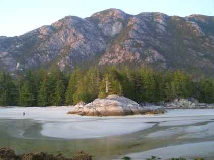 White sand beach at Campania Island. Mt. Pender is peak on right