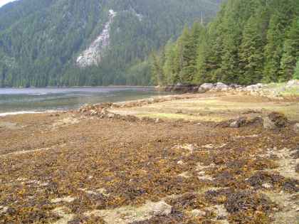 (Grenville Channel)--20 miles Left Evening Point about 9:45 AM. Few sprinkles in the night. Pearl disturbed by number of vessels passing in the night, but otherwise very nice camp. Light SE breezes to Kxngeal Inlet. Then breeze picked up and we made better time on 10-15 knot breeze. We sailed most of that time, paddling perhaps 30 minutes only. Decided on a whim to go into Baker Inlet, as looked intriguing through narrow passage of Watts Narrows. Pretty setting with mountains in background with many patches of snow. Main wildlife sighted was kingfisher at Watts Narrows. Strong gusty headwinds and hard opposing current as we exited. Took short pee breaks 2 times, but beaches rough and barnacled and ate bars and dried fruit in boat for lunch. Continued sailing north once back in Grenville Channel. Checked out potential campsite at south entrance to Kumealon Inlet, then went on and found good site at north side--just east of Kumealon Island. Rain became fairly hard as we were reaching camp, but good shelter in forest. Had dinner under shelter of cedar and spruce trees. Sailboat anchored in bay just to the north. Much more traffic on Channel today--lots of motor yachts and a BC ferry and a couple tugs, a few commercial fishing boats. Counted about 6 different types of moss here. David noticed large cedar tree, still living but hollow on inside and burned up to 20-30 feet on inside with ax marks on inside as well. Has noticed a number of others on this trip.