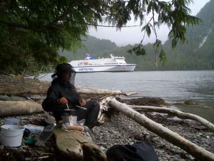 Pearl cooking dinner near Evening Point, BC ferry in Grenville Channel