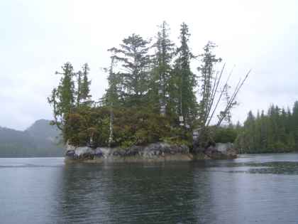 Turret Rock in Nakwakto Rapids at slack water. Note sign boards nailed to trees by previous visitors who stayed on rock during 6 hour tide cycle.