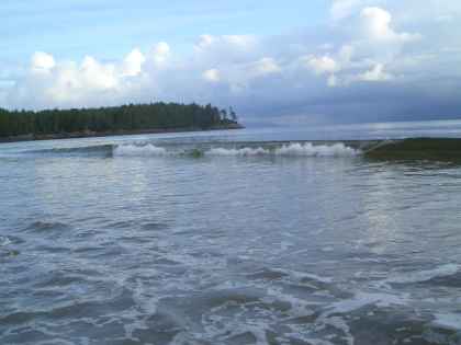 day Day off. Pearl up around 9AM; David got up to pee and went back to bed and got up around noon. Pearl walked beach and investigated NW beach meanwhile and finally came back to bed and read awhile. Finally breakfast of granola early afternoon, filtered some water and then hiked over to West Beach on very brushy trail--also very wet since it had been drizzling all day. Passed lagoon with lots of water lilies. Took trail from West beach to The Cliffs at Hakai Beach--fancy resort. Met Fred and his wife, caretakers during the off-season, which because of the economy, is all year except 6 weeks at peak of summer. Very windy from SE on West Beach. Noticed couple kinds of berries on trail--Pearl tasted a couple with no ill results so far. She also enjoyed watching osprey defending fledged juvenile from bald eagle. After returning from West Beach did some research about currents and Hakai Passage and future camping options and then got some dinner. Continues drizzling to almost rain. |
