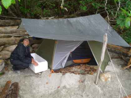 hot, sweaty wetsuits--what a relief! Got to intended camp at entrance to Hunter