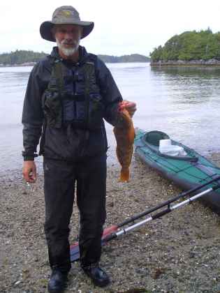 day Both slept until 10 AM. Listened to weather forecast at 6:30 AM--no go for today as strong NW winds predicted. Listened to rain falling and in no hurry to go out in it. After breakfast came back to tent and read a chapter of The Golden Spruce. Got up and had lunch, then David messed with paddle grips and Pearl found trail across Island. David also straightened rear rib in boat. Tried to start fire to dry clothes--only moderate success with fire, hard to get wood to catch. Went out fishing and immediately caught large copper rock fish, which put in stroganoff for supper. Ravens now talking over remains left on beach. Forecast good for Goose Island in AM. Alarm set for 3:30AM.