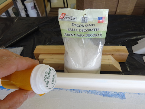 ...then sand was sprinkled onto the wet paint. (The pill bottle has 1/16" holes drilled in the cap and serves as the "sand shaker.") After drying, two more coats of paint were applied. |  Deck after re-installing hardware and new toe rail. |