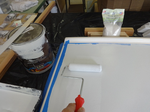 We used Valspar semi-gloss latex paint from Lowes for the deck and cabin. When the weather was hot and dry, we added Floetrol to help it flow better. |  We used Sherwin Williams Infinity semi-gloss paint for the hull and some of the exterior wood work. Here we're painting over teak, as we don't want to spend our sailing time keeping up with varnishing or oiling wood. |