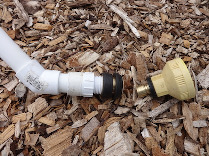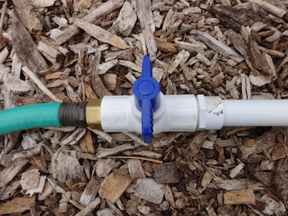 (Above) Irrigation manifold and rotary sprinklers at center of garden. Sprinklers are mounted on a homemade manifold with valves that allow us to use either 1 sprinkler, 2 sprinklers or all 3 sprinklers at once. Note layout strings and also the hose bibb which is used to fill a sprinkling can for occasional hand watering of newly planted beds.