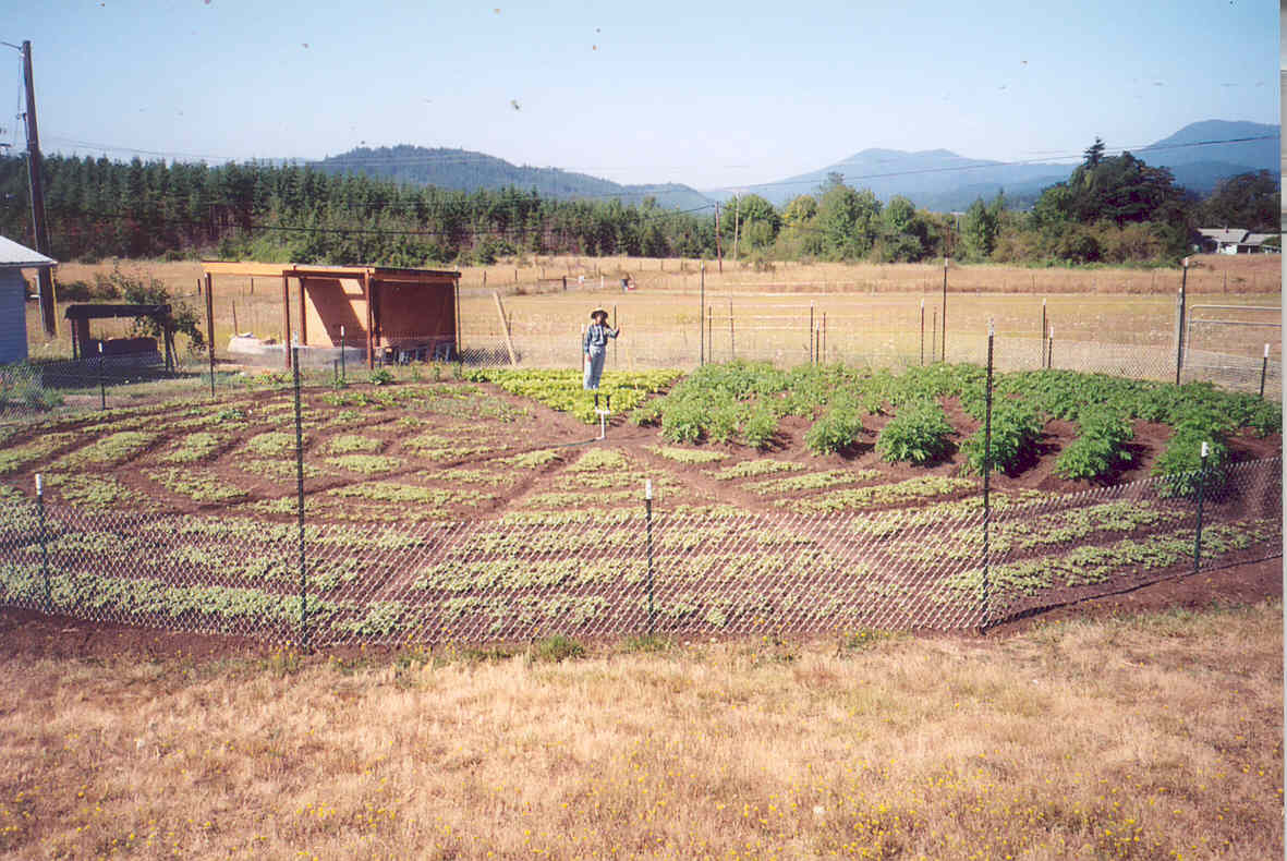 Garden from 2004 to 2014: We enjoy gardening and also consider it to be one of the most important aspects of our home economy. We've long wanted to have a garden large enough to grow a significant portion of our yearly food needs, not only in terms of vitamins and minerals, but also calories, which is one area in which most gardens fall short. In the summer of 2004 we finally had an opportunity to put in a large garden on the farm in Oregon's Willamette Valley where we spend May through October of each year. During the past 3 years, this garden has surpassed our expectations about what can be produced in a home garden. Each of the past 3 summers it has yielded an average of 600-700 lbs. of potatoes, 100 lbs. of dry beans, 130 lbs. of tomatoes, 170 lbs. of squash, 100 lbs. of beets, 60 lbs. of green beans as well as onions, melons, salad greens, peppers, eggplant, okra and enough basil to provide fresh pesto daily for several months. Below is a description of our Oregon garden and why it is laid out as it is: