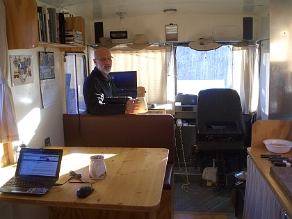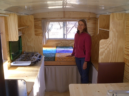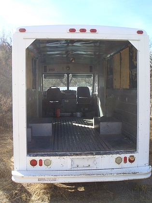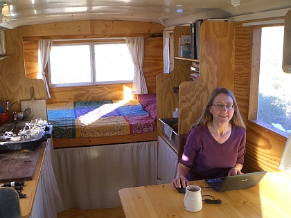 a step van in 2013 (Note: The following section was written in 2015) True to our nomadic tendencies, Pearl has long been captivated by the idea of living in a converted school bus. In 2010 we happened to come across a used step van in good condition and at a great price. In what was one of the few impulsive decisions we've ever made, an hour later it was ours. In the winter of 2011, we spent a couple months of spare time work converting it into a tiny home. Later in 2011 we moved it to our property in Cascabel and in early 2013 we moved into it. With one exception, we've been quite happy with it. The exception is that, like all vehicles parked in the desert, it's a packrat magnet. We returned to Arizona this fall to find the engine compartment filled with saguaro fruit, cholla and prickly pear cactus and just about everything else the packrat could carry. Fortunately, there wasn't much damage to the wiring, which is a common result of packrats nesting in vehicles. We'd already considered moving the van to Oregon and making it our summer home there. The packrat was encouragement in that direction. In 2014 we drove the van to Oregon, where it has become our summer home. Packrats aren't much of a problem there and we greatly enjoy life in the van during the summer months.