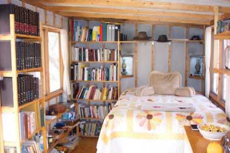 ![]() Interior of new cottage. The floor space (8' x 16') and layout is exactly the same as in our old cottage. Much of the furniture, shelves, etc. that we've lived with for the past 19 years is transferred from our old cottage to the new one. | ![]() Other end of new cottage. The lack of interior walls gives it an open feel. Heating during winter mornings and evenings is with a small wood stove. Cooking is done on a 3 burner propane stove. 5 windows give plenty of light during the day and good ventilation when needed. The insulation has significantly reduced our wood consumption during winter. We burn about 1/4 cord per winter. | |