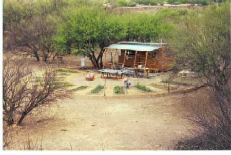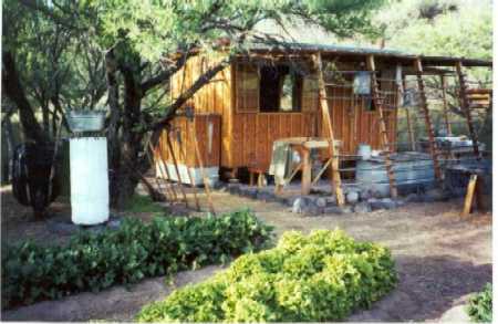 Our tiny home in Cascabel, Arizona (Note: The following section was written in the early 2000's) When we moved to Arizona in 1997, we decided to live in a temporary structure and then, if life in the desert suited us, to build a more permanent home. So, we began by constructing a small, portable cottage. What we've discovered in the intervening years is that, for a host of reasons, our little abode was the favorite of all the dwellings we've ever lived in. Indeed, we've given little thought to a larger or more permanent house since. At 8 feet wide and 16 feet long, it is laughably tiny by American standards and has no running water and only minimal solar powered electricity. Nor does it have many of the features commonly considered "necessary" in a house; aside from lacking running water or grid power, it also has no bathroom, pantry, washing machine or refrigerator. It is distinctive not in what it has but in what it lacks. It comfortably provides just the shelter we really need and no more, thus maximizing our freedom: we have no mortgage payments, no homeowner's insurance premiums, no mechanical noises, little maintenance expense, negligible utility costs and little extra space to fill with encumbering "stuff". Originally, an important aspect of the design was portability since we were living on cooperatively-owned land and were unsure of how long we would live here. It has an axle and wheels that bolt on underneath and can be pulled behind a pick-up truck. Should we eventually decide to move we hope to leave little evidence of our tenure here. Some visitors interested in sustainable building have questioned our use of wood as a building material. We chose wood in order to keep the cottage lightweight and thus portable. With respect to building materials, our priority was more quantitative than qualitative. Although the lumber used was not a local resource, the quantity used in our entire cottage was less than that in the roof of most homes. We focused on making the structure as small as was reasonably possible in the ways described below.