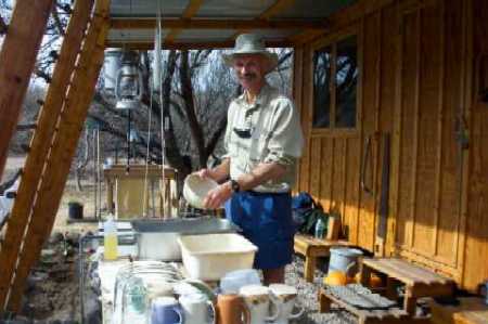 ![]() In the evening, we lift the 5 gallon hot water can out of the solar water heater box and carry it to the shower stand where we fill the shower bucket. We usually shower just before going to bed. The solar water heater is the same one we've been using for the past 19 years. In winter, we often put the 5 gallon can on the wood stove in the evening to heat it. | ![]() Pearl pours graywater into a mulch basin. As we have for many years, we continue to use the 7 basin method with a separate mulch basin for each day of the week. So, there's a Sunday tree, a Monday tree, etc. This gives micro-organisms in each basin a full week to break down fats, oils, etc. in the graywater. The soil under the mulch remains absorbent and we never experience odors or see standing water. Desert trees like mesquite and white thorn thrive on the graywater. | |