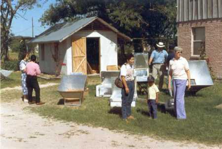 A variety of solar oven designs displayed at a Solar Oven Workshop at Casa Juliana in the mid-1990's.