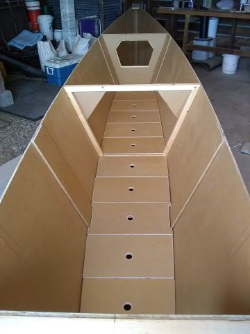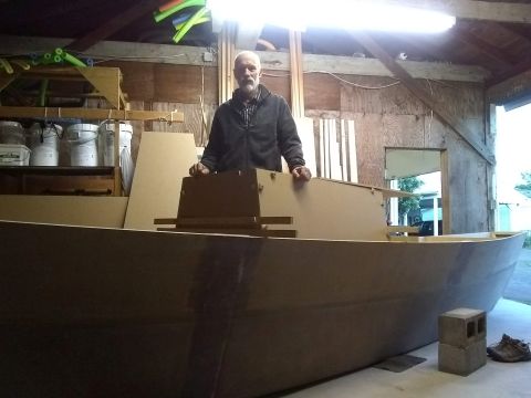 ![]() First hull turned over and ready for deck and cabin work. |
