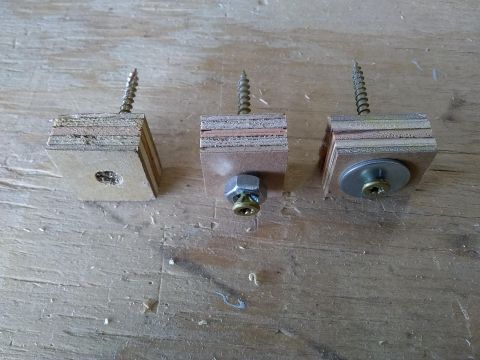 ![]() A refinement of using the small ply blocks and deck screws in place of wood clamps is to put a nut or washer under the screw head. Otherwise, the screw head tends to get buried in the ply as it's tightened, making it difficult to get the screw out without breaking the ply block. |