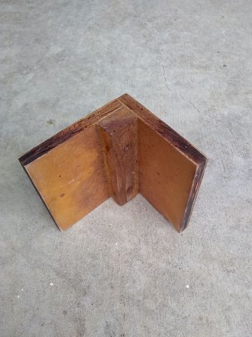 ![]() This is the test piece of MDO we showed in the "Miscellaneous Photos From The Shop" page. Over the winter it was submerged in water for 5 full months. Right after we pulled it out of the water we stood on as before to test the strength. It didn't flex or come apart, so appeared to still be at full strength. Although it's a bit discolored, there's no delamination. |