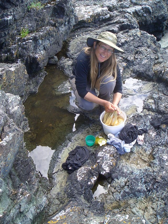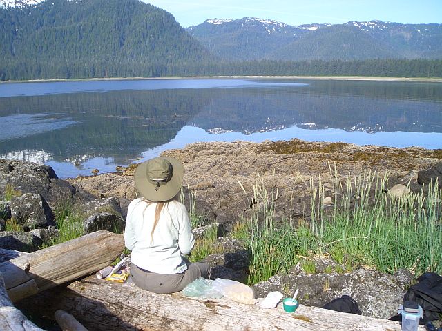 Island)--0 miles Up to alarm at 4 AM. Listened to forecast, which stated NE winds at 15 knots in AM, switching to NW in afternoon. Although calm at that time, decided to not take chance on 11 mile crossing of Frederick Sound. Also, feeling like day off would be welcome. Went back to sleep and woke about 9:30. Calm and sea flat. Moving slowly got some breakfast, then walked over to island peninsula and scouted out some mostly freshwater pools. Decided to bathe and do laundry. Totally beautiful site for bath, right out above shoreline looking out on Frederick Sound. Filtered sun, warm day. Hung up clothes on limbs of tree fallen out of forest onto beach. Lunch of bagels peanut and butter and jelly, dried pears and apples. Feels like a wonderful life except some level of feeling duped by weather forecast. Try to just enjoy the beauty and relaxation. David now trying to find leak in Thermarest pad—not able even though dunked in pools. Messing around with other little odds and ends of improvements and repairs: how to reef sail more quickly, purifying water (we love the Aqua Mira drops--way easier than filtering), trying to neutralize the velcro at the necks of our rainjackets that catches on everything. Also watching boats on flat sea: 1 sailboat, lots of commercial fishing boats (10 at one time), 1 cruise ship. Drone of fishing boat engines all afternoon.