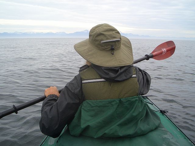 Island)--19 miles Up to alarm at 6 AM. Listened to weather and decided to do first leg of outside of Kruzof Island. Mostly cloudy with breeze up bay as we paddled out shortly before 8:00AM. Salisbury Sound mellow, little swell. Breezes remained light as we paddled out to open ocean. Had hoped for some sailing and tried briefly when breeze shifted from light SW to NW, but inconsistent and too light. Humpbacks blowing frequently—one breached in distance in Salisbury Sound. Out from Gilmer Bay 8-9 sport fishing boats. To Shelikof Bay entrance about 2 PM. Breeze just then filling in from north. A few light showers during paddle. Found beautiful sand beach on north side of bay about half mile in from entrance. By then mostly sunny and Mt. Edgecumbe appearing out of the clouds across bay. All together stunning spot. Plus beautiful stream with flat rocks, so bathed again. Ate dinner and then put kayak back in water and paddled toward head of bay—David hoping to find major steam and see bears. Saw camp in distance on back beach, then to our horror, 4-wheelers started buzzing down beach—very disappointing when we had found the place so enchanting. From our beach watched whale in bay fin-slapping over and over.