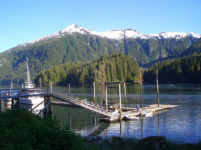 Island)--13 miles Up to alarm at 7:30AM and sunny skies. Easy camp dismantle and boat loading. Chatted with purse seiners and then to Lea Lea, Chuck and Laura's boat, for pancake breakfast. Good coffee, great pancakes with Vermont maple syrup. Left about 10:05AM. Paddled out to gusty north wind, which was rather discouraging, but fortunately ended once we were well outside the bay and became light northerly breeze. Stopped at large waterfall just before Kasnyku Bay. Then on to Hidden Falls Hatchery dock by around 3 PM. Chatted with Trenna, Jason's wife (whom we had met at Warm Springs), about living here, her concerns about the kids and bears. Walked past fiberglass nursery tubs about 20 in diameter and over to weir where king salmon were coming up into holding pond and where sow grizzly was catching them as they did so and teaching cub. Adam (hatchery manager) invited us to camp on new float, which we accepted. Paddled back over to check on bears, but none this evening. Hatchery raises mostly chum salmon here for Asian market. Clouds moving in by evening.