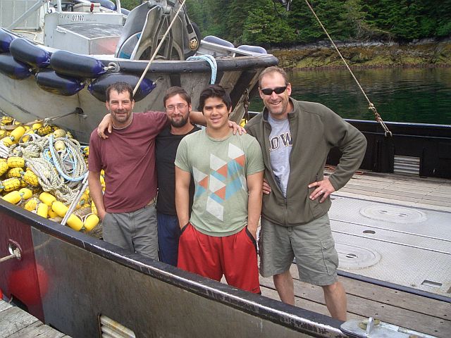 Mitch and crew of purse seiner Rose Lee. Thanks for the invitation to coffee, Mitch! (Kasnyku Bay, Baranof Island)