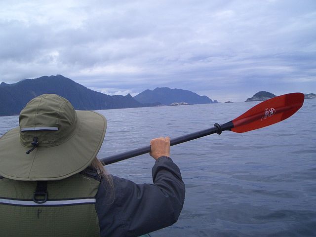 Island)--8 miles Rain much of night, sometimes fairly hard. Woke about 7:30AM. Leisurely pack-up and breakfast. Left about 11:45AM across Sitka Sound. Wind picked up to 15-20 knots, with seas 3-5 feet. Took several crests across deck. Boat handled it well even if Pearl didn’t. David sat for 10 minutes trying to get photos of heavier seas. Shortly thereafter SE wind picked up even more, but we were soon in lea of islands. Had lunch of PBJ at north end of Kasiana Island—well-protected. Paddled across and made landfall at white bucket with red flag put out by Doris. Carried kayak up boulder seawall then loaded gear into Doris’s car. Met Linda Schmidt briefly and left kayak beside her house. Doris made us at home, with our mountain of gear. She's a remarkable lady, 93 years old, but lives alone, leads Tai-Chi class several times a week and drives (stick shift!). Chatted with Doris, then decided to go out for groceries. Pearl collaborated with her on a dinner of rock fish, rice, broccoli, pumpkin pie and ice cream. All tasted fantastic. Then Doris set up computer and David started on email update. Wonderful hot showers before settling down on her sofa bed.