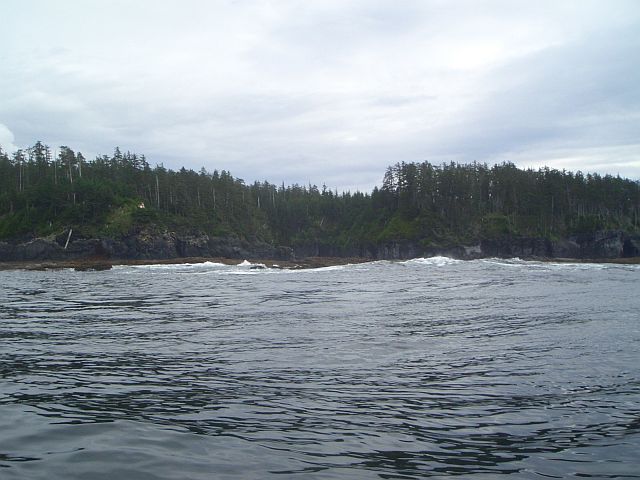 Island--20 miles Woke at 4 AM to boat motor at dock. Looked out and saw seiner tied up. Turned over and went back to sleep, awakening again at 7:30AM. Were packing up on float when a voice said, “Good morning.” It was Mitch, owner of the seiner, the Rose Lee, who invited us for coffee. We went over and met the crew and sat at their galley table for a half hour or more, chatting about their work and our trip. We learned what a high-dollar game it is, with boat worth about $1 million and permits for various fisheries up to another $1 million or so. The net alone, made of a high-tech material, was $80K. Very friendly group: Mitch, Greg, Lance, Mitchell and Chris, who was subbing as skiff operator for the regular guy whose brother recently went overboard and was lost out in Gulf of Alaska. We asked about Portage Arm, a potential shortcut for us, and whether it goes through on high tide. None of them and no one at the hatchery seemed to know. Mitch's spotting plane came in while we were there and when he returned, he'd flown over Portage Arm for us. Report of many logs on north side dissuaded us from trying it. Finally off about 10:45. Saw an orca shortly after leaving. Bay fairly calm, but rougher as we got out to Chatham Strait. Put the sail up in SE breeze and moved along nicely. Occasional breaking swell/waves, especially when tide worked against wind, but mostly very nice downwind ride all the way up to NE point of Catherine Island where we turned onto Peril Strait. Before making that turn we had already noted helicopter in constant motion on north side of Catherine Island. Turned out to be logging operation on Native land. Helicopter would pick up 3-4 logs at a time on a long cable from the slopes above, then carry them down and drop them on a barge at the shore, where a crane was piling them up. Tug standing by in channel. Looked like a recipe for an accident. Had some tail wind in Peril Strait, then it switched abruptly to NW and quickly became quite strong and miserable to paddle against. Still made another mile or 2, but started looking for campsite. Found one on a small island with cobble beach. Shack just in from edge of forest. We decided to sleep inside on the lower bunk tonight. Took little hike after dinner. Lots of clams squirting on tidal flats all around us. David checked out stream on Catherine Island. Some bear sign, though not like on Admiralty. A few drops of rain today, some sun, now very overcast. Lots of pleasure boats and fishing traffic in Peril Strait.