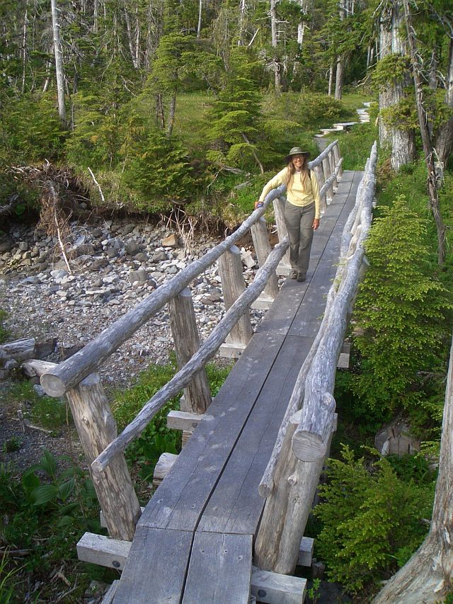 | Day 29, June 30--Fred's Creek (Kuzof Island)--0 miles Slept till 8. Up and had breakfast looking across Sitka Sound. Hit trail to Mt Edgecumbe about 9:25AM. Hiked on extraordinarily well-maintained trail of crushed gravel, boardwalks, stairs and footbridges across mostly boggy meadow and lightly wooded terrain. Streams mostly dry draining side of volcano. Trees in bogs stunted like a bonsai forest. Reached timberline, then began following dozens of posts about a hundred feet apart up steep alpine slopes for last .6 mile. 45 degree angle on pumice ball bearings. Slow and treacherous going (for Pearl). Seeing clouds moving in David went on ahead. He met party of 3 people from Sitka at top and 6 more apparently on trail around crater rim in addition to lone woman near beginning of steep slope. Got a couple photos to north before clouds descended. David to top about 1:15 PM. Pearl arrived at top about half hour later, totally exhausted. View opened up again as she got there revealing Fairweather Range 150 miles to north and eventually south almost to end of Baranof Island also. Magnificent views as clouds shifted from time to time. Also of Shelikof Bay and large meadow/bog at head of it. Rock and snow in summit crater. No steam or other evidence of activity. Ate granola bars, cheese sticks and dried apples. Then hiked around crater rim. Long descent, but pleasant in evening sun. Back to camp 7:50, where we met 2 young women, med techs from Sitka, who had paddled a triple kayak with a dog from Sitka and were backpacking heavily laden to shelter. We doubted they would make it by dark. Doubted they had listened to weather forecast either, as rain predicted for tomorrow.