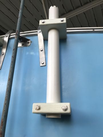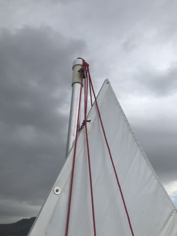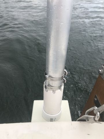 ![]() 2" (51mm) OD aluminum mast slides inside 2" (51mm) PVC pipe which is secured to transom with through-bolted wood blocks. The top of the PVC pipe is slotted to accept an aluminum key which is secured to the mast with hose clamps. In use, it's important that the cross bar faces the wind. To do this, the mast is lifted slightly, rotated into position and lowed into one of the 8 slots. |