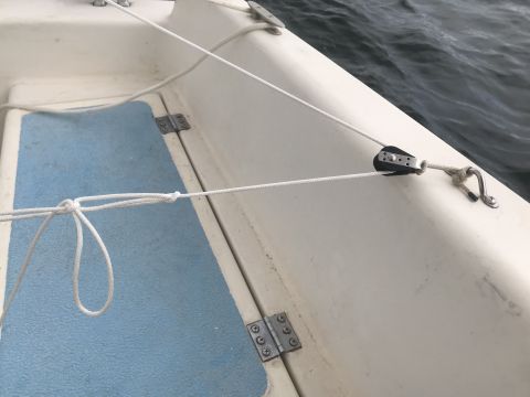 ![]() Ball bearing block on port cockpit coaming. The steering lines are secured to the tiller with quick release knots. For more convenience, 2 small clam cleats will be mounted on top of the tiller to make securing the steering lines quicker and easier. |