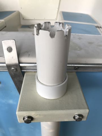 ![]() Closeup of 2" (51mm) PVC pipe mizzen mast socket. The collar on top of the block prevents the pipe from sliding downward. It's cut from a 2" (51mm) PVC coupling, then slid down the pipe and glued in place. |